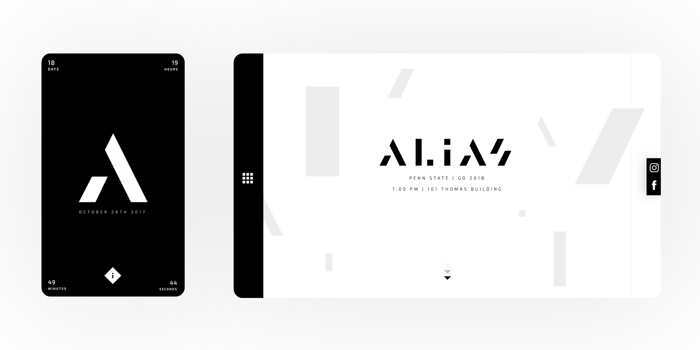 Alias was an internship show put on by the Penn State Graphic Design class of 2018, where a colleague and I were tasked to design and code a website for promotional purposes. The site featured a teaser with a parallaxed background and a countdown to the event. Upon entering the site each student was represented with a short description of their summer internship and a link to their personal site.